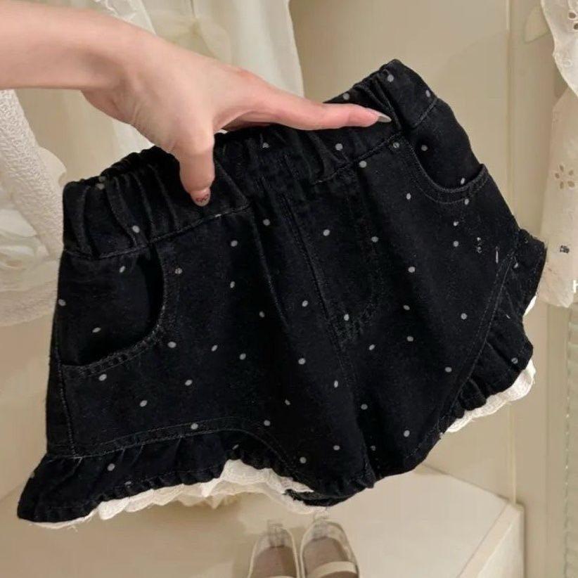 Black short with white dots& cute embroidered top